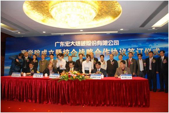 中国工程院汪旭光院士、安徽理工大学颜事龙校长、中南大学校长助理李夕兵教授、资源与环境学院副院长陈建宏教授、北京理工大学博士生导师张同来教授、南京理工大学化工学院院长刘大斌教授、暨南大学管理学院副院长谭跃教授、中国铁道科学研究院顾毅成研究员、中国有色工程设计研究院刘殿中教授,广东省人事厅专技处贺东处长、广东省经信委张汉成副处长,广业公司总经理助理夏赛秋等领导莅临现场,与宏大公司员工一道见证了宏大商学院的成立。汪旭光院士与公司董事长、总经理郑炳旭先生共同揭牌,宣布宏大商学院的正式成立。公司执行总经理方健宁先生与中南大学、安徽理工大学、南京理工大学、暨南大学四所知名高校在现场签订校企战略合作协议。