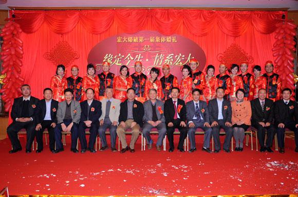2010年1月18日,花都九州阳光酒店多功能厅内一派喜庆气氛,公司第一届集体婚礼在这里隆重举行。在热烈、喜庆的气氛中,8对新人步入婚姻殿堂,携手谱写幸福生活新篇章。“缘定今生,情系宏大”,道出了在这里喜结连理、佳偶天成的8对新人的共同心声。