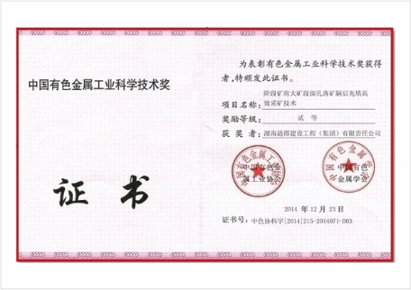 2013年开始承担采矿工程,根据矿床赋存属中厚急倾斜矿体的特点,技术团队提出了“阶段矿房大矿段深孔落矿嗣后充填高效采矿技术” (FCM采矿法) 并已成功实施, 大大减少了矿房分段, 节省了采准巷道投资, 提升了矿房形成速度,提高矿石回收率。该采矿方法获中国有色金属协会科学技术二等奖。