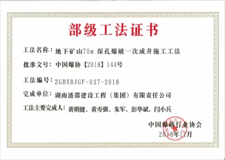 同时,为配合FCM采矿法, 解决高天井的施工难题, 项目部技术团队在国内首次实现了70m切割天井一次成井技术的重大突破, 解决了常规天井施工在受限空间内安全风险大、 危害因素多、 安全管控难等问题, 从本质上实现了安全快速施工。该施工方法获得中国爆破协会科技进步二等奖和部级工法证书。