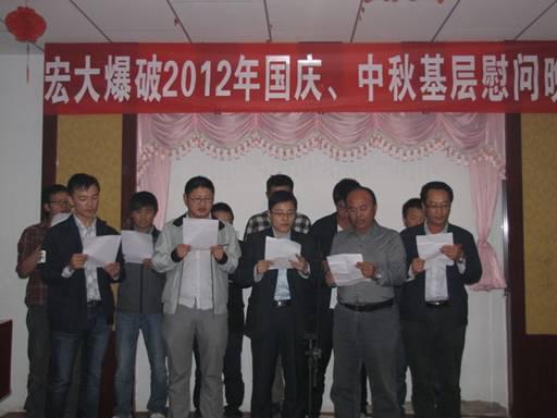 月到中秋分外明,又是一年团圆时。宏大公司继续传承每年中秋节前对各分子公司、项目部、地面站一线人员进行节日慰问的优良传统,在郑炳旭董事长的领导下,成立了中秋慰问领导小组,以党委书记宗粤琦为组长,执行总经理方健宁、高级顾问李应儒、副总经理李萍丰、郑永伟、梁发、总经理助理王丽娟、工程事业部副总经理肖文雄、民爆事业部副总经理曹洁明等为副组长,党群文化中心、人力资源中心、行政中心、工程事业部、民爆事业部相关人员、2011年度先进个人代表等为组员,共分成 4个慰问小组,于9月10日-26日到各分子公司、项目部、地面站开展慰问活动。中秋慰问领导小组认真部署、精心筹备,各慰问单位积极响应、鼎力配合,使此次慰问活动进行得非常顺利,取得了很好的反响,达到了预期目的。