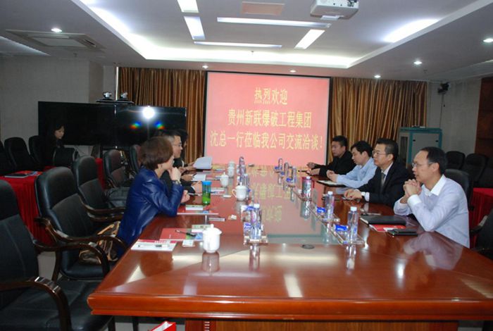 3月24日,贵州新联爆破工程集团有限公司沈晓松总经理及其团队与宏大爆破董事长郑炳旭、总经理助理崔晓荣、营销事业部副总经理刘传侦、总经理助理陈前辉等领导在宏大爆破总部进行交流会谈。
