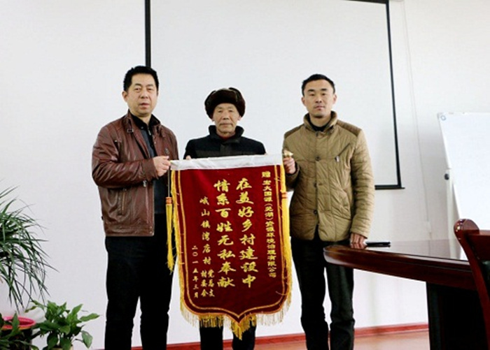 3月11日上午,峨山镇湾店村书记邢家宝一行三人来到广东宏大爆破股份有限公司控股子公司:宏大国源(芜湖)资源环境治理有限公司(以下简称:宏大国源),为感谢我公司对其村在美好乡村建设事业中的无私帮助,特赠送印有“在美好乡村建设中情系百姓 无私奉献”的锦旗一面,公司副总经理翟英在5楼会议室进行了热情接待和交流。