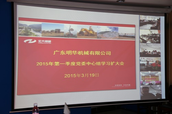 3月19日下午,广东宏大爆破股份有限公司全资子公司:广东明华机械有限公司(以下简称:明华公司)在公司本部会议室召开了2015年第一季度党委中心组学习扩大会议。公司党委委员、班子成员、纪委委员、本部正副部长参加了会议,各下属公司中层及以上领导干部通过视频参会。