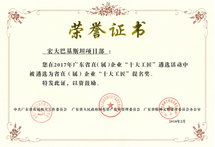 2月11日,在由省直机关工委、省国资委、省文明办联合举办的“省直(属)企业‘十大工匠’”遴选活动中,宏大爆破有限公司巴基斯坦塔尔煤田项目部荣获提名奖。