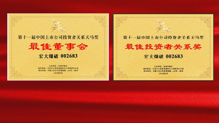 5月13日,由证券时报主办的“第十一届中国上市公司投资者关系天马奖”评选揭晓了本届获奖名单。宏大爆破凭借优秀的公司治理、卓越的董事会建设和优秀的投资者关系管理,荣膺“最佳董事会”和“最佳投资者关系”两项大奖。