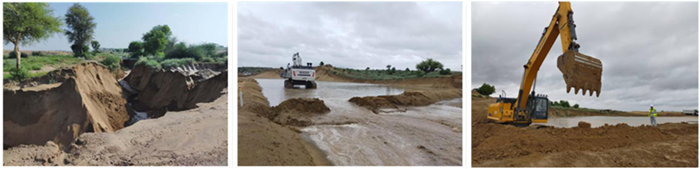 二季度抗旱,三季度抗洪。雨季来临,沙漠中雨势匆匆且磅礴,极易冲毁边坡、道路。项目部提前制定好抗洪抢险预案,实时关注天气变化,挖好防洪沟,修筑好防洪挡墙。通过“小水堵,大水疏”等方式,保护好现场运输道路及边坡。在雨季停工期间,还完善了巴方营区、现场办公室、排场休息亭等临时设施,为后续增产打下了基础。
